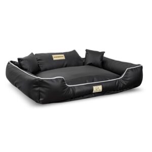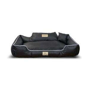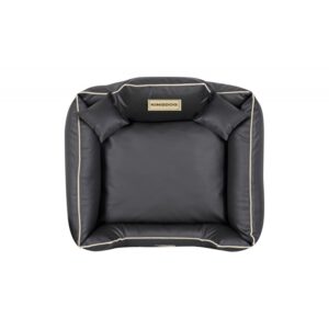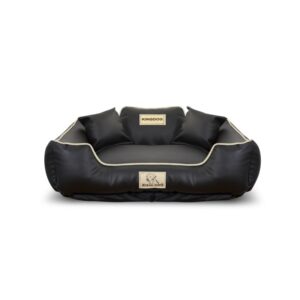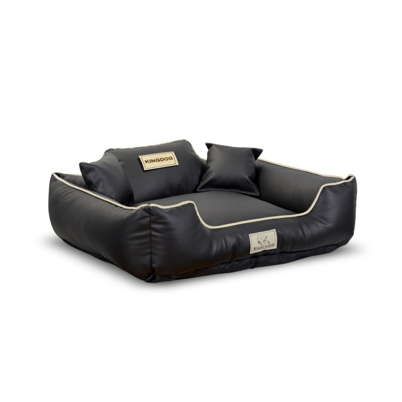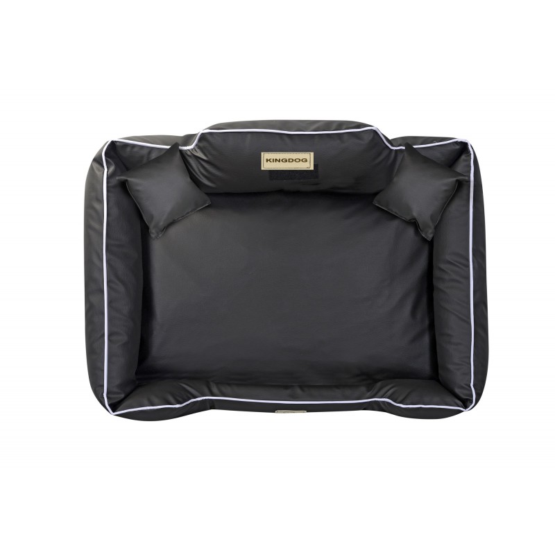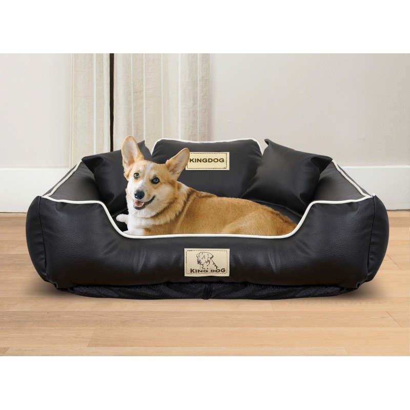 Wykonane z EKOSKÓRY, ROZBIERALNE z zamkiem, antypoślizgowe legowisko dla psa KINGDOG w kolorze czarnym z białą lamówką, PERSONALIZOWANE imieniem pupila!
